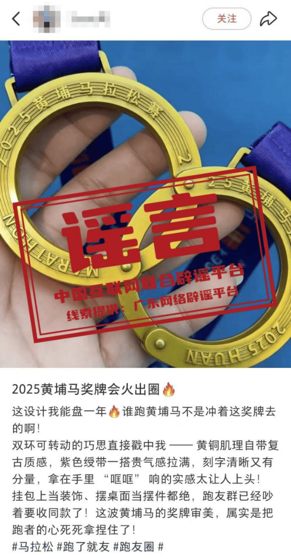 详情:近日,网传“2025黄埔马拉松完赛奖牌为手铐型”消息引发关注。对此,2025黄埔马拉松赛官方组委会回应称该信息不实,网传图片系P图或AI生成。据悉,2025黄埔马拉松完赛奖牌为圆环结构,其设计灵感源于精密齿轮轴承,致敬黄埔深厚的制造业根基。奖牌中央的圆环内圈镌刻的开拓者雕像、科学城地标、知识城九龙湖等图案,在同轴转动时可交替显现,宛如一条缩微的“城市发展能量带”,隐喻着个人拼搏精神与城市前进动力的同频共振,实物并不能如网传图片那样打开并呈现“手铐型”。(来源:“广东省互联网举报中心”微信公众号、南方网)